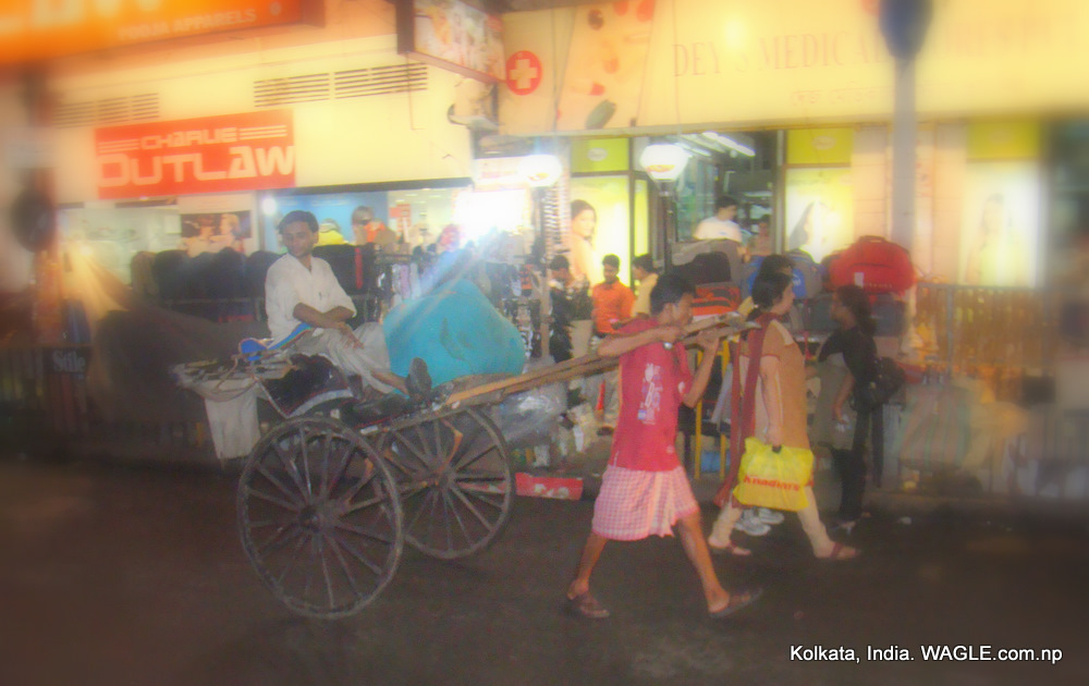 The people in the lanes most regularly use rickshaws- not the poor but people who are just a notch above the poor. They are people who tend to travel short distances, through lanes that are sometimes inaccessible to even the most daring taxi driver. An older woman with marketing to do, for instance, can arrive in a rickshaw, have the rickshaw wallah wait until she comes back from various stalls to load her purchases, and then be taken home. People in the lanes use rickshaws as a 24-hour ambulance service. Proprietors of cafés or corner stores send rickshaws to collect their supplies. (One morning I saw a rickshaw wallah take on a load of live chickens—tied in pairs by the feet so they could be draped over the shafts and the folded back canopy and even the axle. By the time he trotted off, he was carrying about a hundred upside-down chickens.) The rickshaw pullers told me their steadiest customers are schoolchildren. Middle-class families contract with a puller to take a child to school and pick him up; the puller essentially becomes a family retainer.
