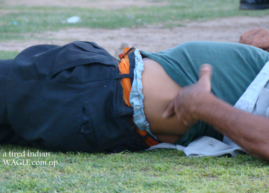 the belt of a tried indian who is scratching