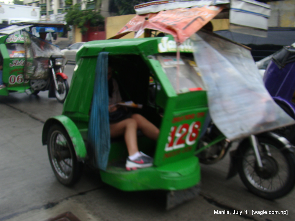 When I first rode a tricycle in Manila I sat behind the driver the way men do in Nepal when they ride pillion on a motorcycle. I was told later by a Filipino friend of mine that that was the wrong way of sitting on a tricycle. The correct way, I was told, was to sit like the way most women-especially those clad in saari- do in Nepal: by hanging both legs on the same side.